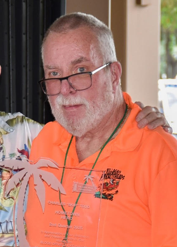 When Skip and his Wife Joanne moved to the Villages, Skip immediately joined the Villages Parrot Heads club and got very involved by becoming a board member as Events Trustee. He later has also taken on the responsibility of being our Blood Drive Coordinator and has been performing this task for over 10 years now. Because of Skip’s enthusiasm and passion for this endeavor, our club is now considered the number one blood drive in the state of Florida. Last year in 2024, we totaled over 2400 pints of blood at six – 2 day blood drives. Where one pint can help save the lives of up to 3 people, we feel that because of Skip’s hard work, we helped over 7,200 people.
